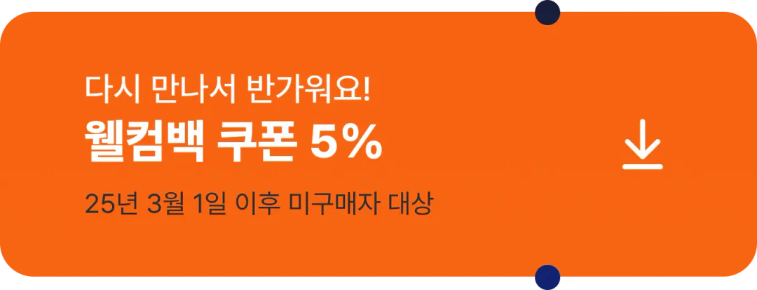 - 웰컴백 쿠폰은 25년 3월 1일부터 구매 이력이 없는 회원에 한해 발급됩니다.