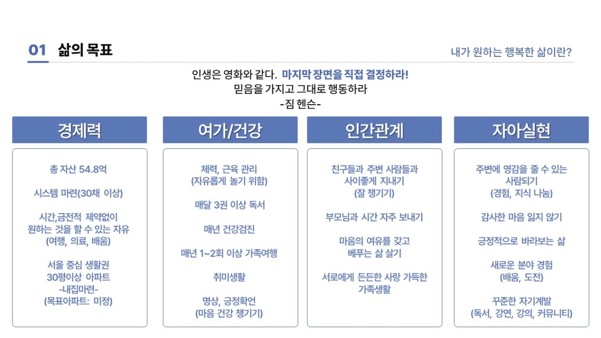 첫번째 열반스쿨 기초반을 수강하면서, 비전보드를 써보고, 처음으로 인생 목표를 생각해보면서 내가 무엇을 중요하게 생각하는지를 알 수 있었다. 그리고, 내가 원하는 인생을 살기 위해서 구체적으로 걸리는 기간이나 , 비용, 내가 해야하는 일들을 그려보며 목표에 가까워지고 있다는 희망을 갖게되었다.
