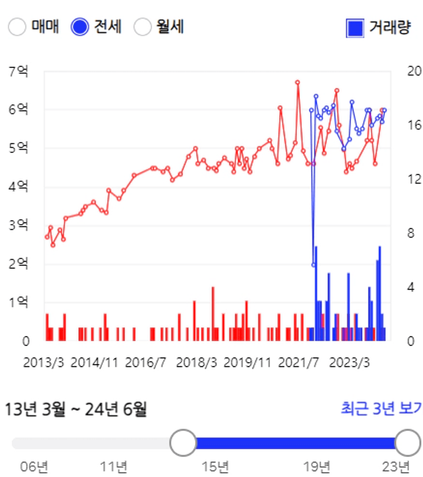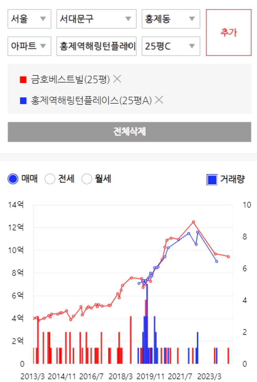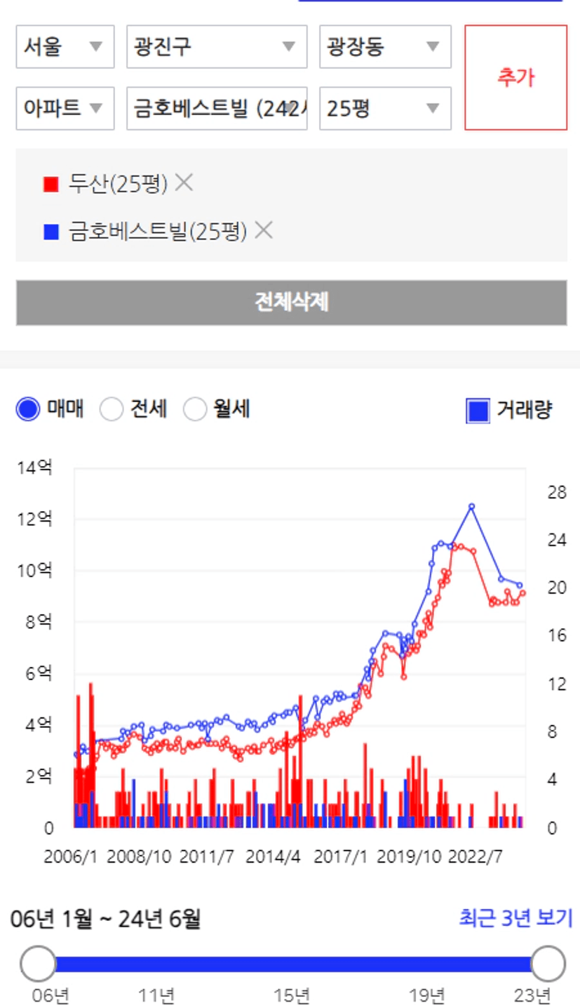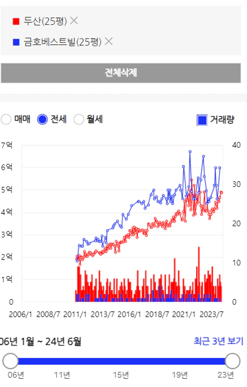 금호베스트빌이 높았다. 6년이라는 연식차이와 학군의 의미가 더 큰듯하다. 학군은 대체 불가여서 전세가 또한 훨씬 높다.