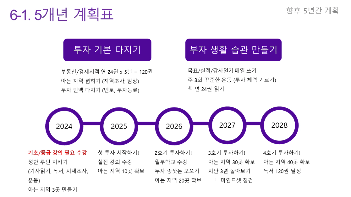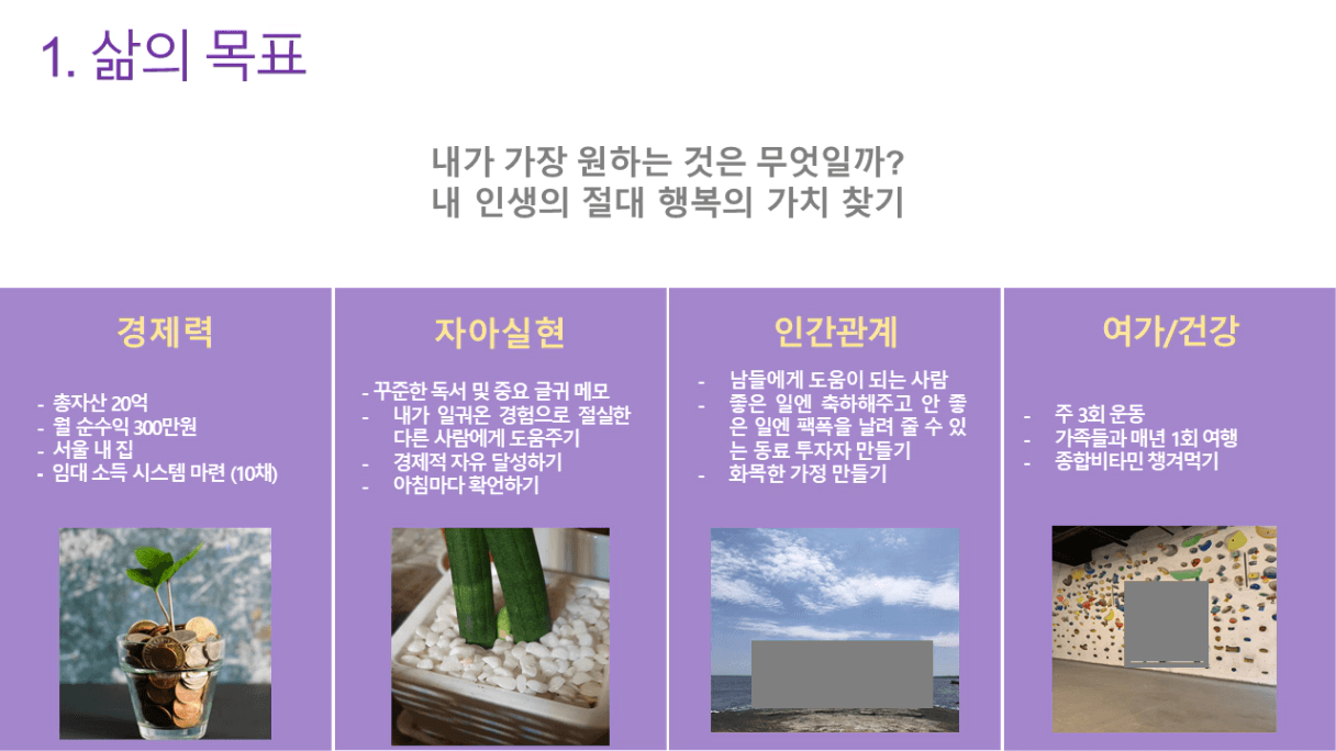 "똘똘한 한채 마련하기, 투자 잘하기" 처럼 내가 원하는 최종 목표가 뭔지, 어떤 삶을 살고 싶었는지에 대한 비전 없이 투자 공부를 하려니 크게 동기부여나 마음에 와닿지가 않았는데요. 근데 비전보드 작성하면서 내가 어떤 목표를 가지고 열심히 해야하는지가 잡히니까 더욱 동기부여 되는거 같습니다. 이번에도 일주일, 한달하고 그만 두지 말고