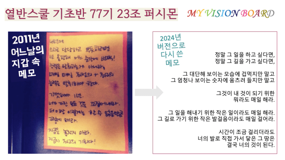 비전보드 작성 수고 많으셨습니다 :) 꼭 이루어 내실거에요. 응원하겠습니다 퍼시몬님!