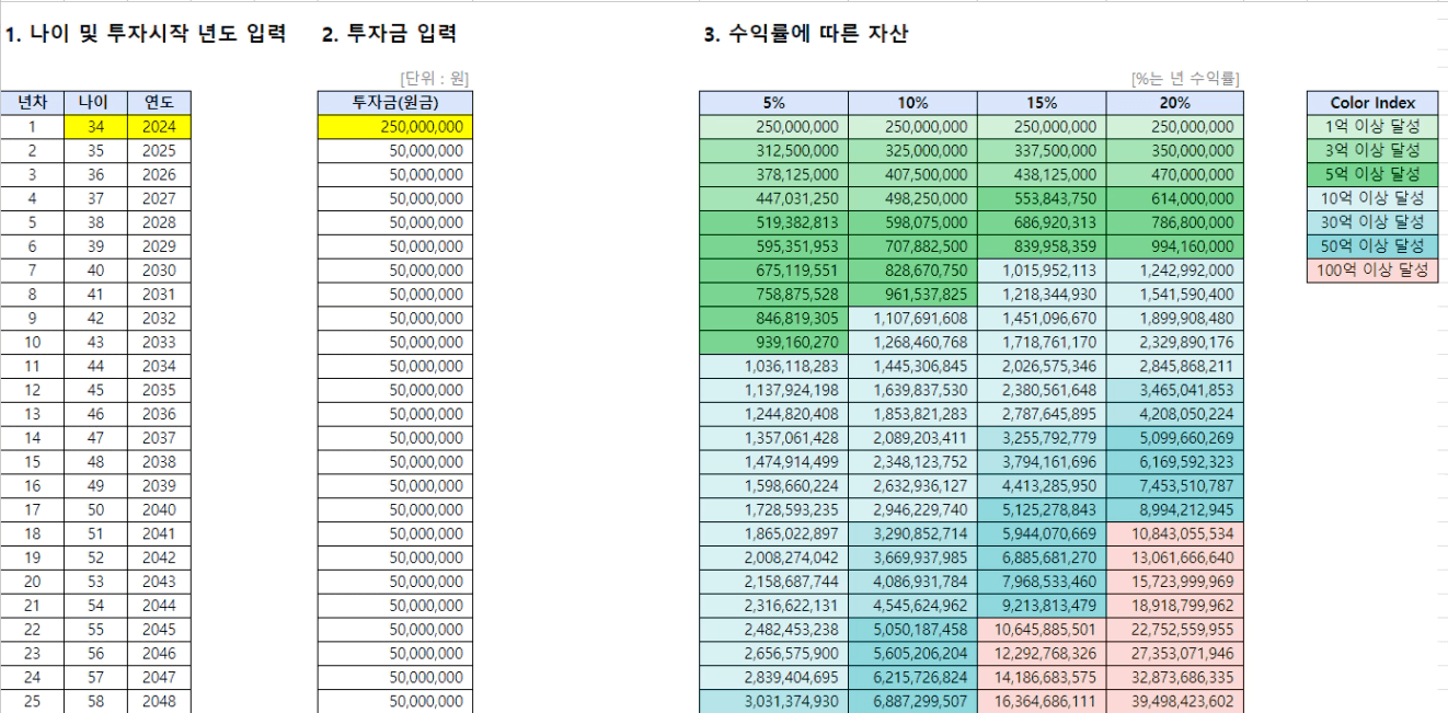 수익율에 따라 은퇴 가능한 나이가 8년정도 차이날 수 있으니 수익률을 높이는데 집중을 해야겠다.