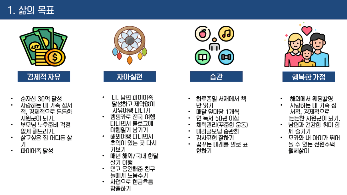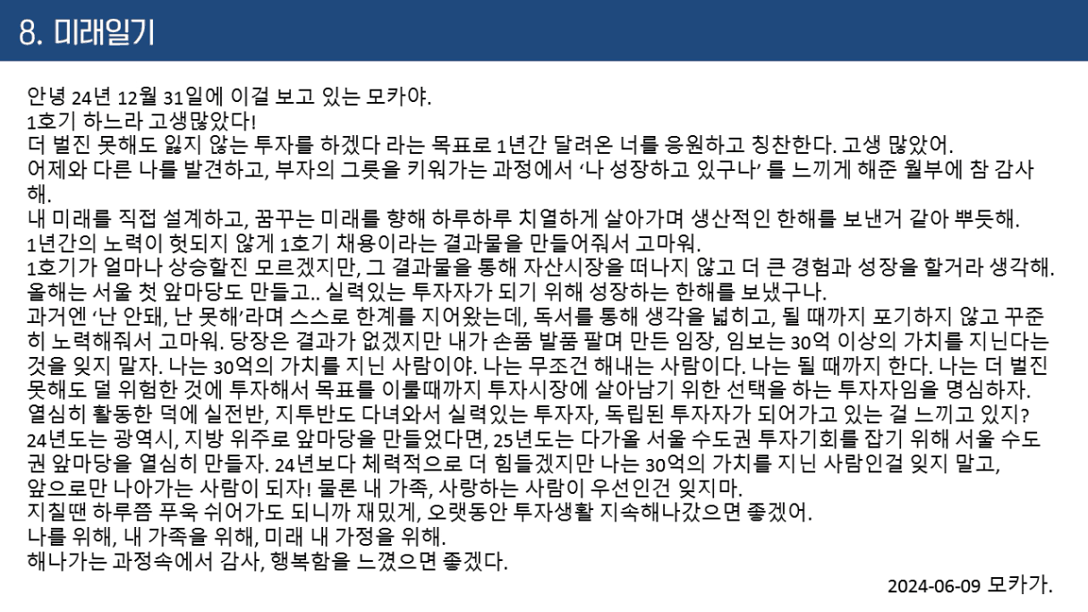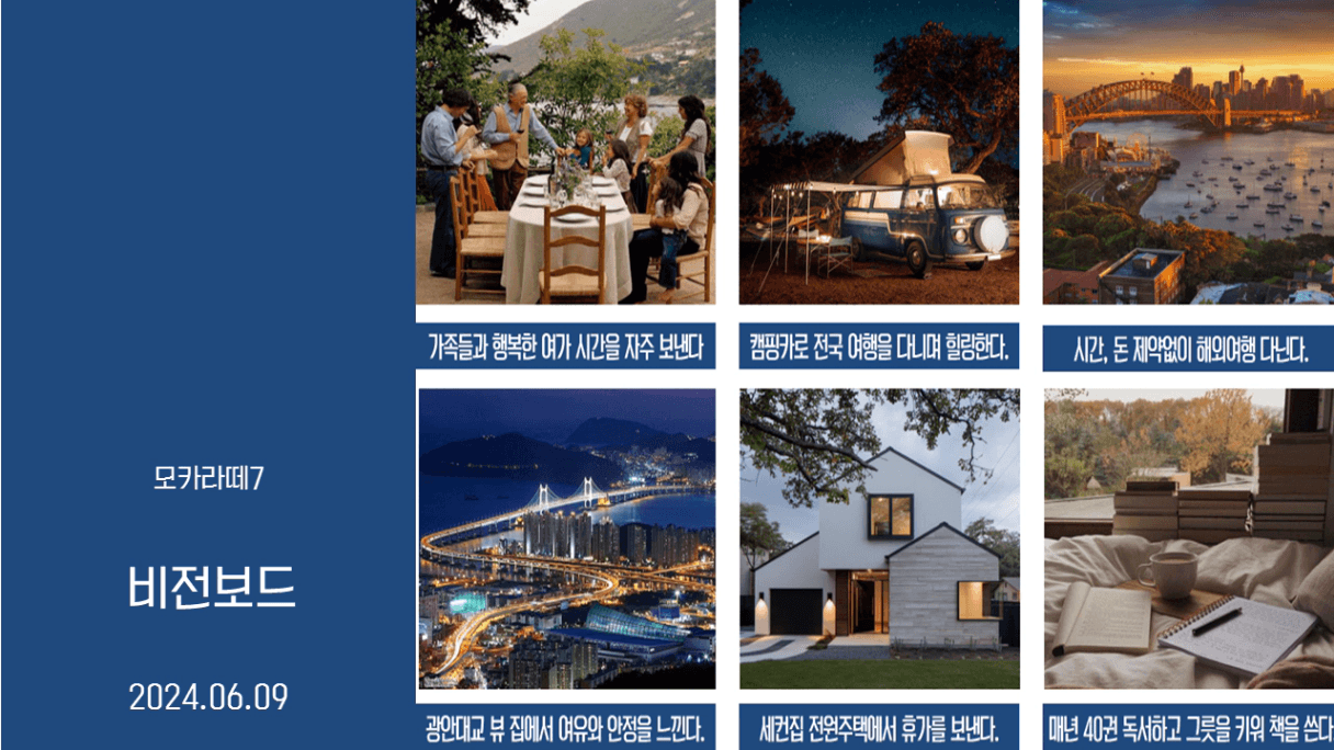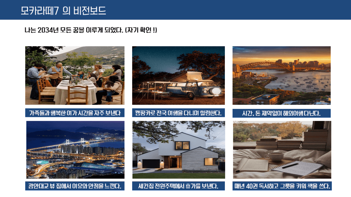 조장님~ 비전보드 잘봤습니다~ 비전보드 계획처럼 현재 엄청 몰입하시는게 눈에 보여요! 찐 1호기 만들어 조장님의 목표가 올해 꼭 달성하기를 응원합니다! 꼭 모든 일이 잘 이루어져 자유로운 영혼이 되어 해외여행 마구마구 하시고, 해외 결혼식! 꼭! 저도 청첩장 주세요~;)