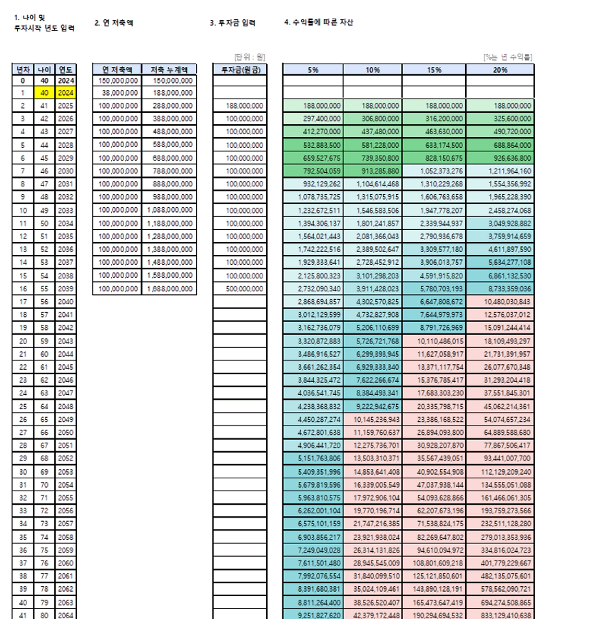 (목표 금액 52억 25백만원, 현재 나이 40세, 현 저축에 1억 8,800만원에 연 1억원 저축으로 시)