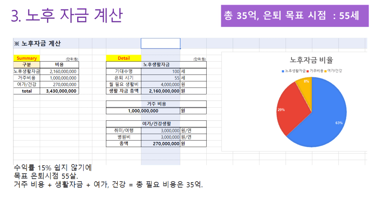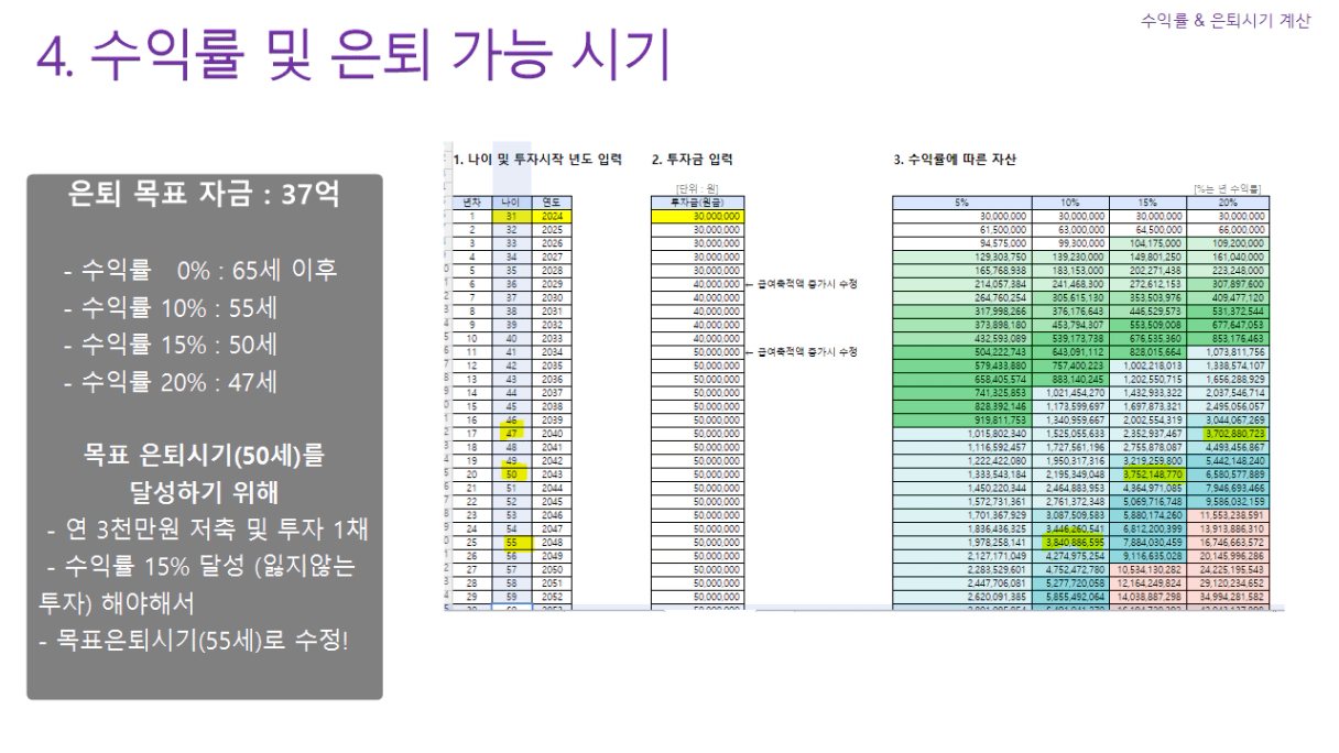 연수익률을 생각했을 때 15%라는 숫자가 부담스러워 은퇴시기를 55세로 더 늦췄는데요. 은퇴시기를 앞당길 수 있도록 수익률을 높이거나 저축한 돈을 늘리는 방법을 생각해봐야겠어요.