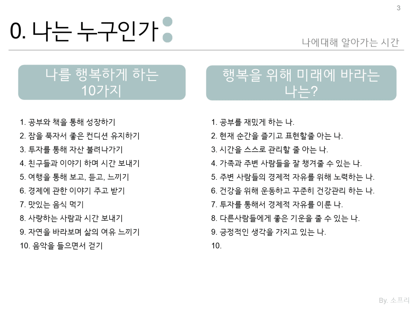 이런것도 적었더라고요. 다시 한번 읽어보면서 나를 행복하게 하는 10가지가 뭐였지? 지금은 뭘까? 생각해볼 수 있었어요.