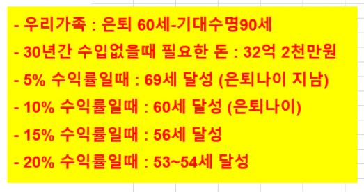 은퇴시기 (소득이 끊기는 시점) = 60세 & 기대수명 = 90세를 반영 (결국 30년간 소득이 없다하면)하여,