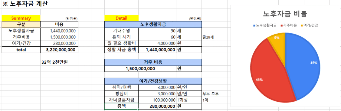 -노후생활자금 = 400만원 (현재 생활비 200만원 안팎에 물가상승률 고려)