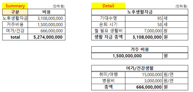 아이들이 초2 쌍둥이라...58세에 은퇴한다고 하면 제가 95세까지 제가 필요한 노후 자금은 52.7억이네요^^