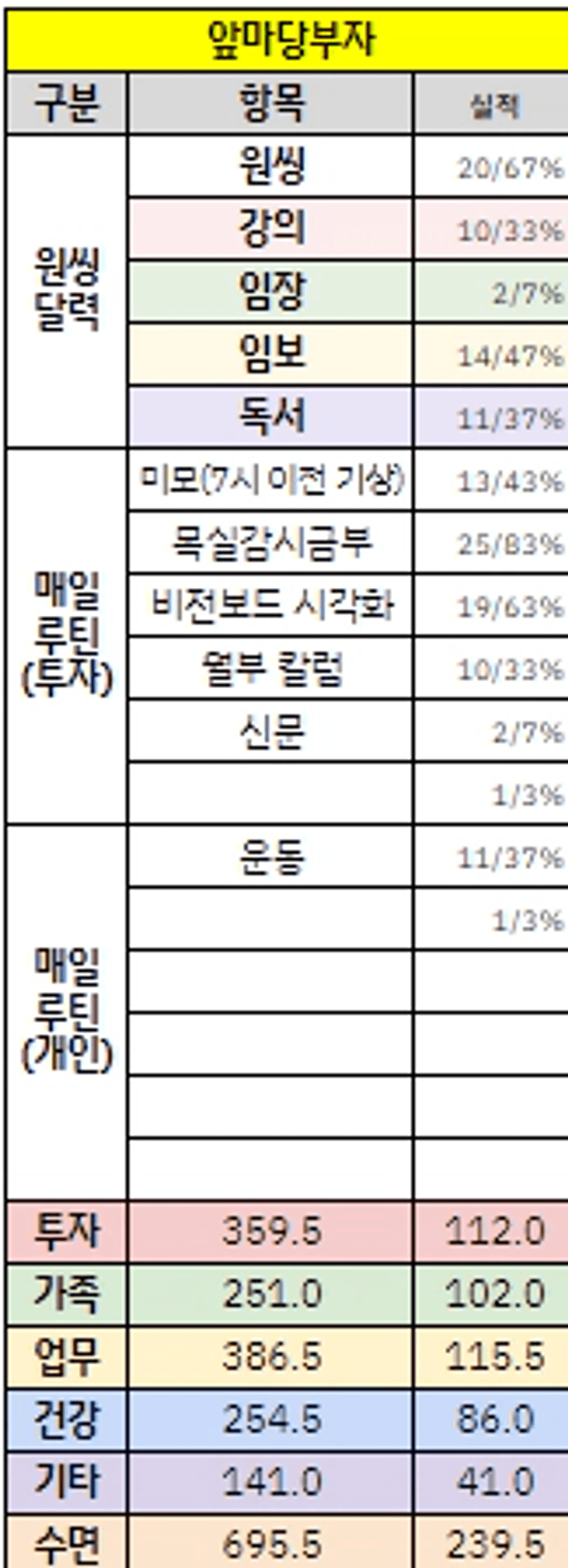투자시간은 비슷했고, 대신 가족과의 시간이 좀 많았다.