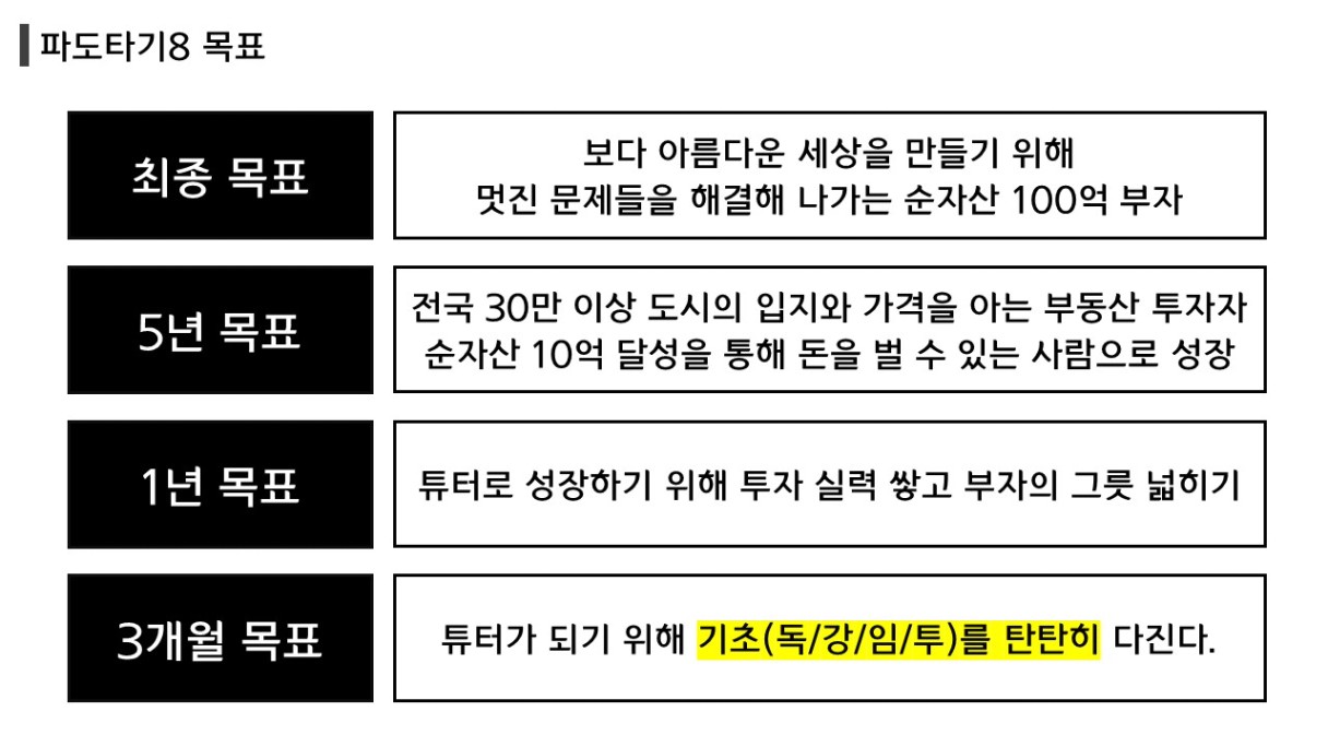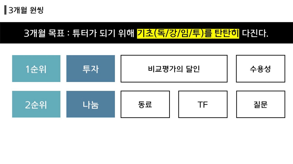 더 좋은 사람, 좋은 투자자로 성장하기 위해 장기적인 관점에서 생각해 볼 줄 알아야 한다는 것을 깨달았던 소중한 월부학교 3개월에 시간이었습니다. 센스 튜터님께서 해주신 피드백을 마음 속에 새기며 소중한 기회로 가게된 학교와 TF 활동을 통해 실력과 나눔에 있어 찐하게 성장하는 시간을 보내고 오겠습니다.