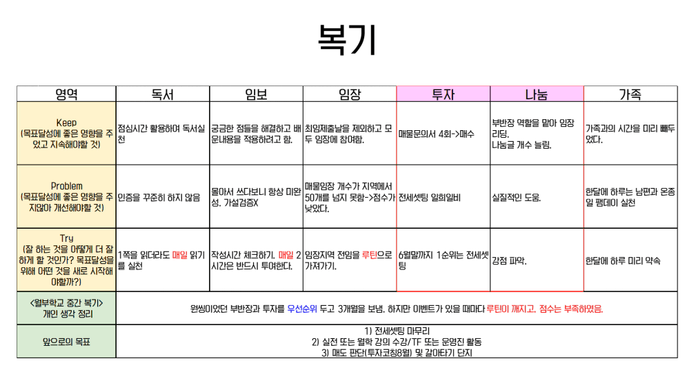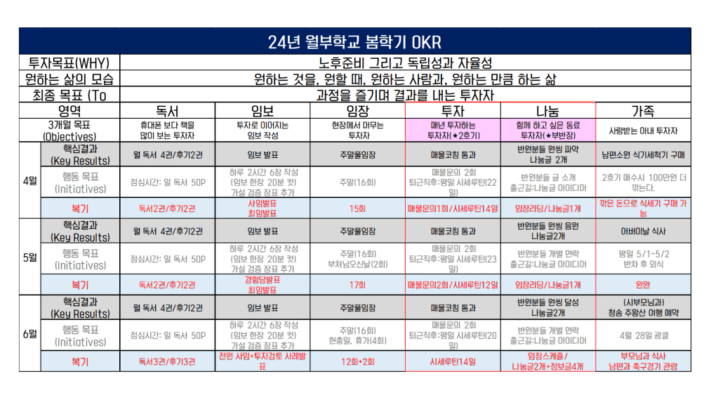 2호기는 전세셋팅 중에 있고, 월부학교 봄학기 강의 수강을 완료하여 2가지 목표를 거의 달성하였다.
