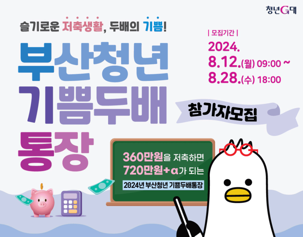 2024년 부산청년 기쁨두배 통장의 모집이 8월 중 진행됩니다. 신청자격, 기간, 방법 알아보겠습니다.