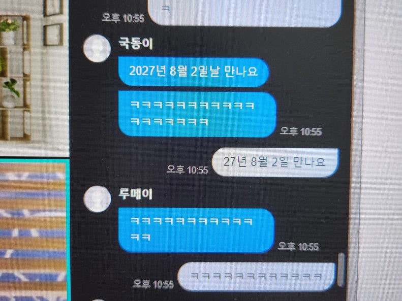 악ㅋㅋㅋㅋㅋㅋ 채팅을 찍었다니 ㅋㅋㅋㅋㅋ 진짜 살도 많이빠고.. 이정도면ㅋㅋㅋㅋ 조장님 우리 마요즈가 마니 성장시켰네요 건강관리까지 해주는 이런 조원들이 어디있습니까 ㅋㅋ 빨리 또만나고싶쥬?