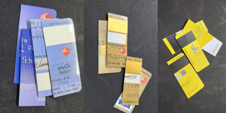 - 그동안 무분별하게 발급받았던 신용카드를 자르고 항목별로 체크카드를 구분하여 만들었습니다.