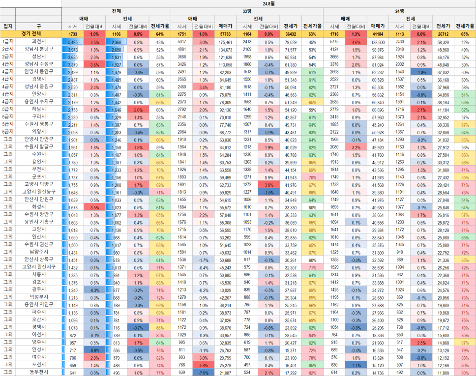 [꿈꾸는파파_Monthly]_ 매매/전세 평단가 및 전세가율_서울 _24년 8월