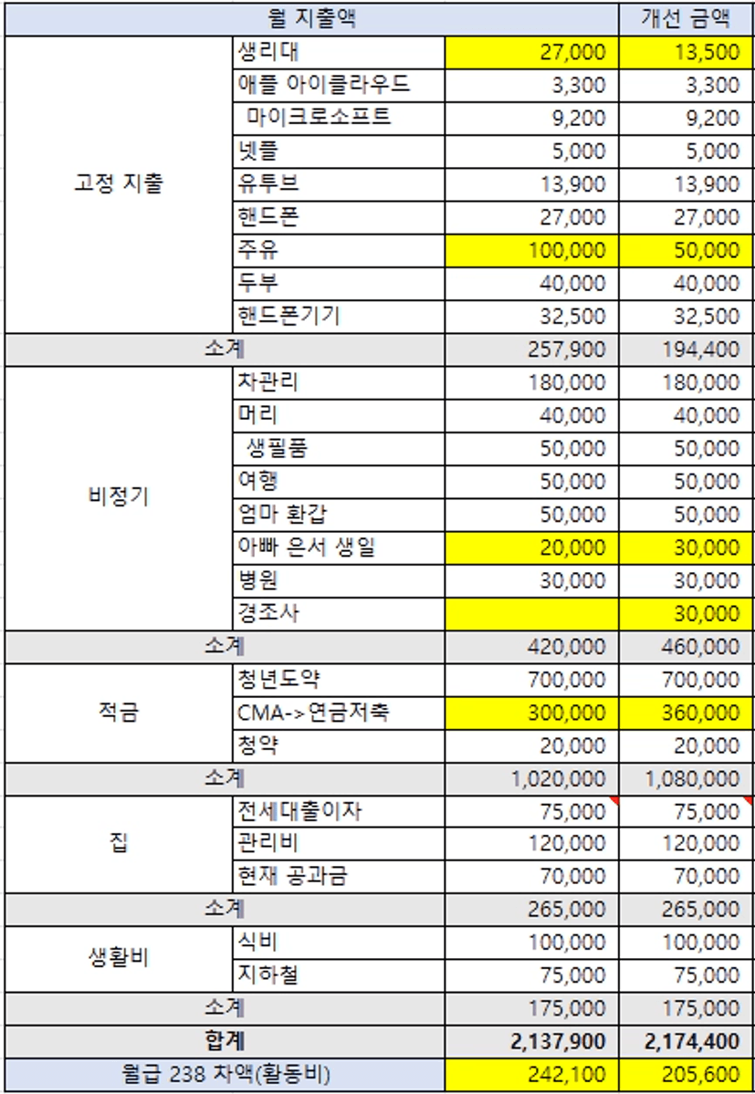 월급 세후 238만원에 월100만원 저축이 목표였고 실제로 43% 모으고 있었다.
