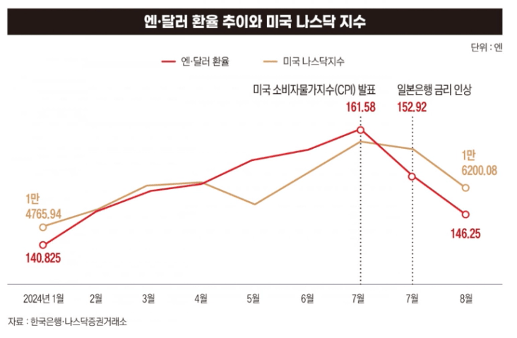 엔·달러 환율 추이와 미국 나스닥 지수를 살펴 보면 지난 7월 일본은행(BOJ)의 금리인상 계획 발표 이후 환율과 나스닥 지수가 급격하게 하락한 걸 확인할 수 있었습니다.