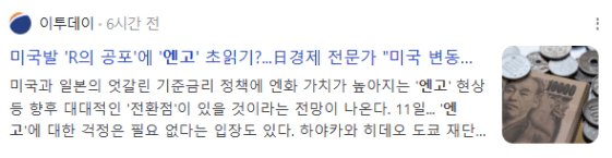 그동안 보기 힘들었던 키워드도 기사에 등장하고 있는데요. ‘엔저’라는 단어만 봤던 것 같은데 어느새 ‘엔고’라는 단어가 기사 타이틀에 등장하기 시작합니다.