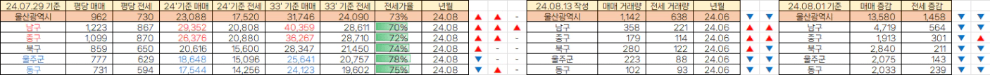 울산은 대부분 매매,전세 모두 상승했습니다.