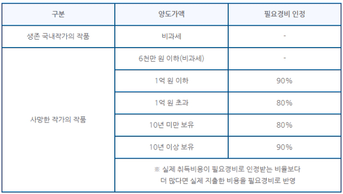 또한 개인이 미술품이 양도하는 경우 기타소득으로 보고 분리과세를 하는데요. 가장 핵심은 양도차익이 아닌 양도가액을 보고 과세하다는 것입니다. 필요경비 인정 비율도 양도가액을 기준으로 합니다. 보유기간, 가액에 따라 필요경비 인정 비율이 달라지네요.