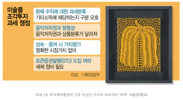앞서 설명한 조각투자의 경우 과세 시 기타소득으로 봐야할지 배당소득으로 봐야할지 쟁점이 있는데요. 현재 미술품 조각투자에 명확한 과세기준이 없다고 합니다. 앞으로 어떻게 기준이 마련될 지 지켜보면 좋을 것 같습니다.