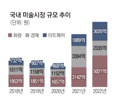 2022년에 국내 미술시장 규모는 1조원을 돌파했었는데요. 아트페어 시장의 규모도 3천억원을 넘었었다고 합니다.