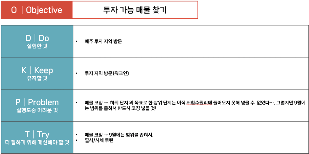 - 임장(현장)에 중점을 두었다 하더라도 임보가 너무 아쉽습니다. 9월에는 양적으로도 늘리고 질적으로도 늘리며, 투자와 연결된 임보를 쓰도록 노력하겠습니다.