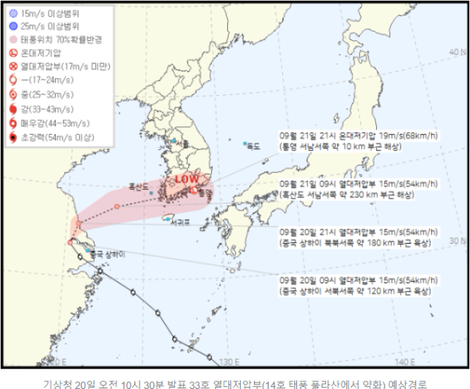 21일 새벽 해상으로 진출해 우리나라에 접근해서