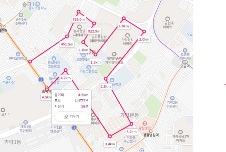 송파역을 시작으로해서 가락시장역을 지나 다시 돌아오는 루트였습니다.