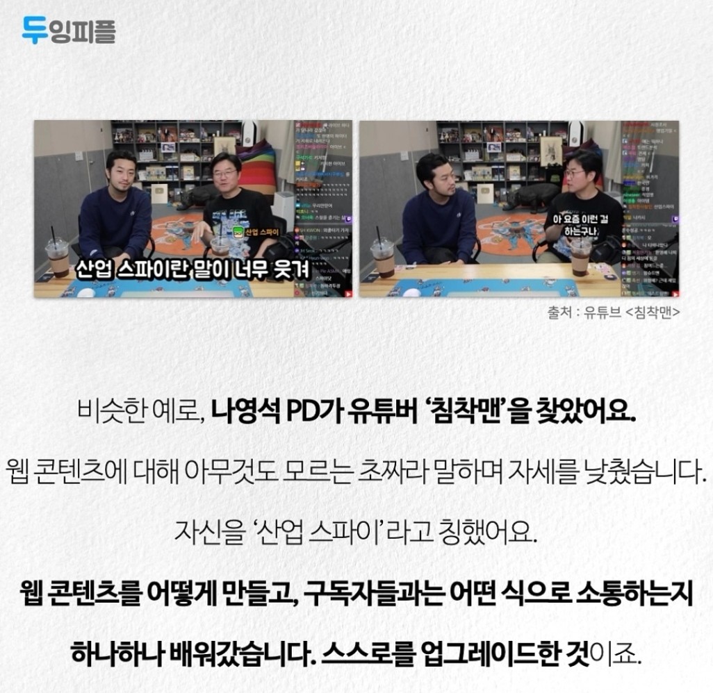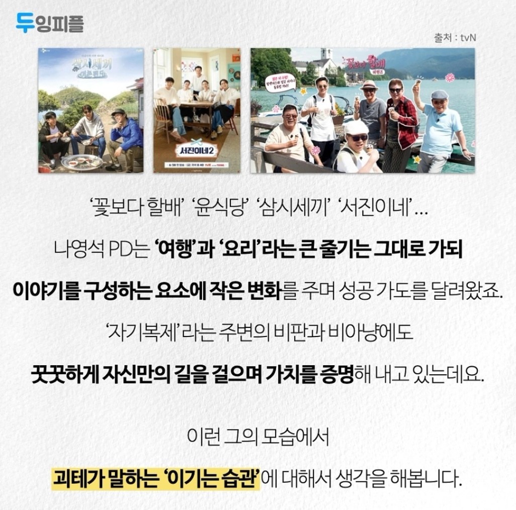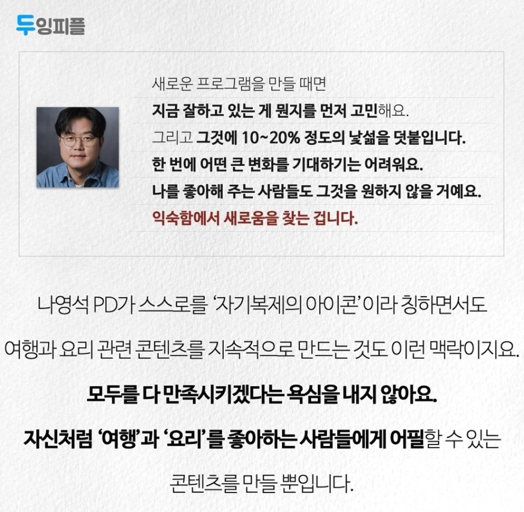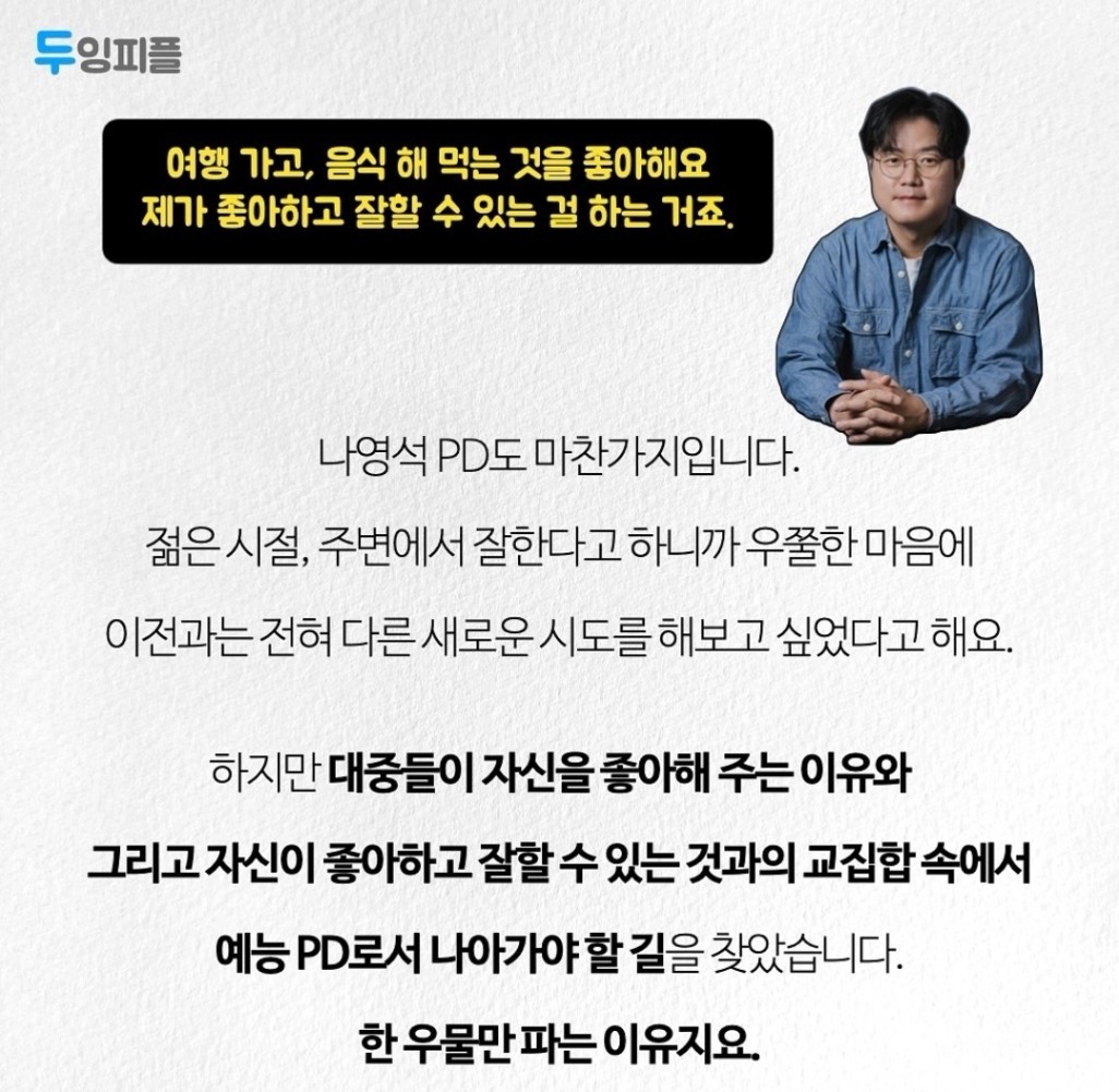 나영석PD가 이야기 하는 자기 복제, 한 우물만 판다는 말이 참 어렵고도 쉽지 않다는 생각을 해보게 되네요.