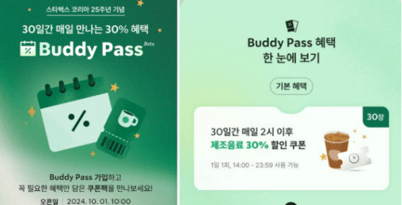 1. 음료 3회 모든 사이즈에서 50% 할인 쿠폰 2매 제공