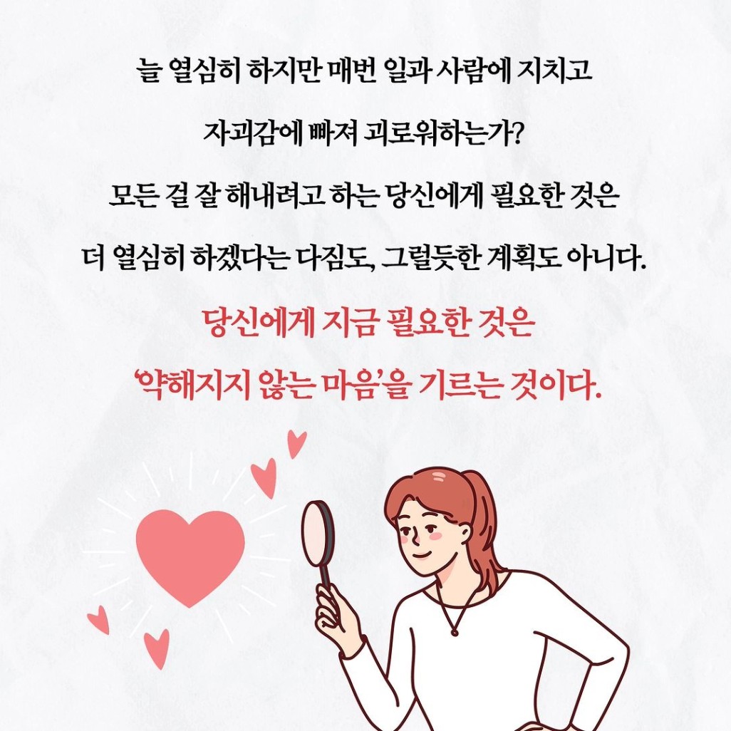 시간을 지나고 돌아보면 별거 아닌 것들이 대부분인 경우가 많기도 하구요 약해진 마음에 너무 나를 몰고 가는 건 아닌지 점검해보면 좋을 것 같네요