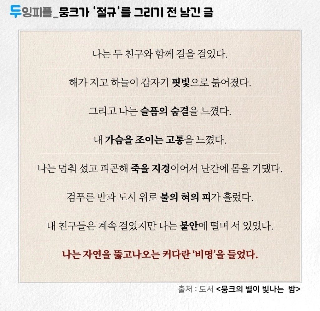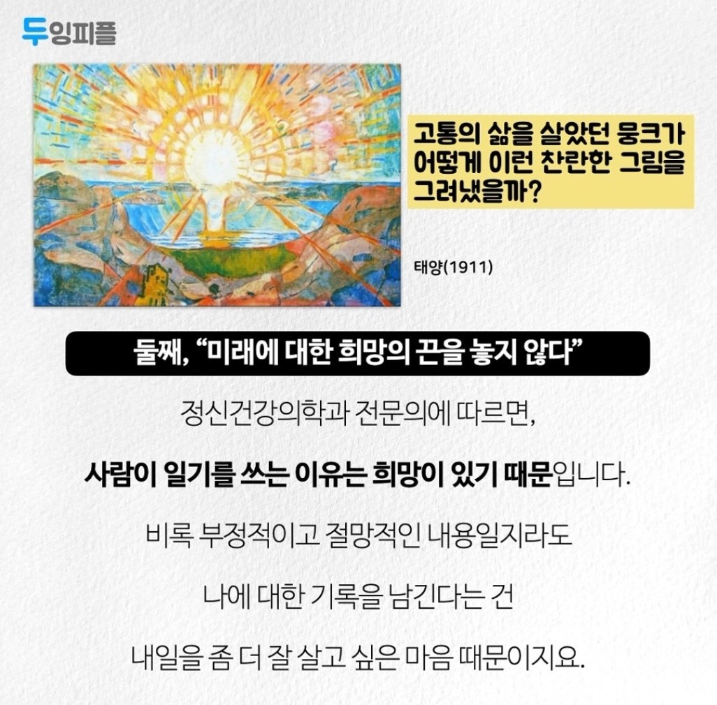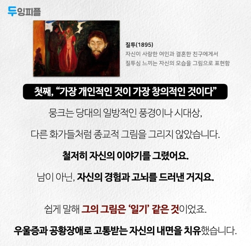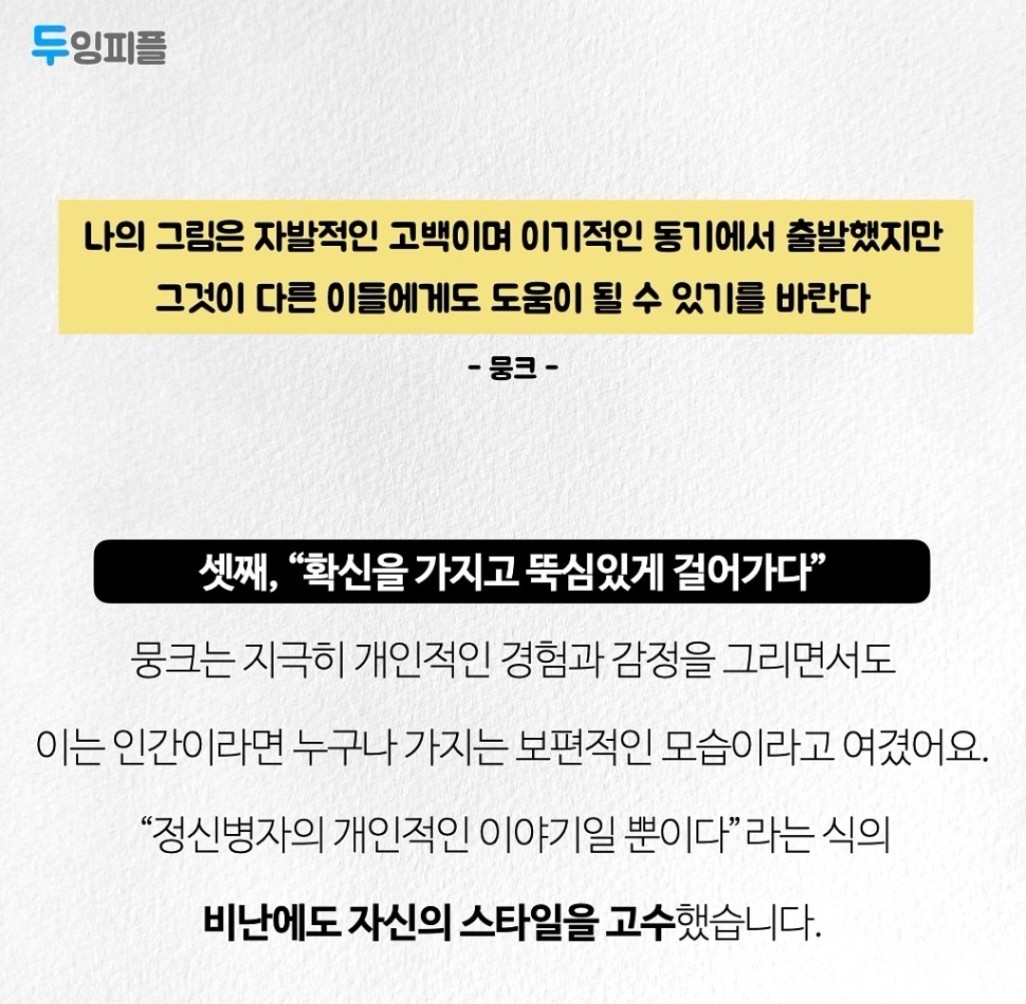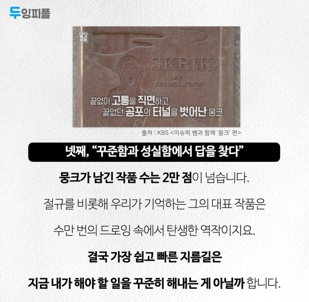 뭉크가 세계적인 화가가 될 수밖에 없었던 이유 네가지를 보면서 미래에 대한 확신, 그 확신을 가지기 위한 꾸준함과 성실함을 통해서 정상에 우뚝 설수 있다는 생각이 들었네요.