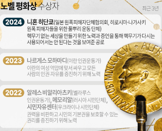 2024 노벨 평화상 일본 반핵운동 단체 니혼 히단쿄 선정 (+최근 수상자, 노벨 문학상 한강, 상금 14억)