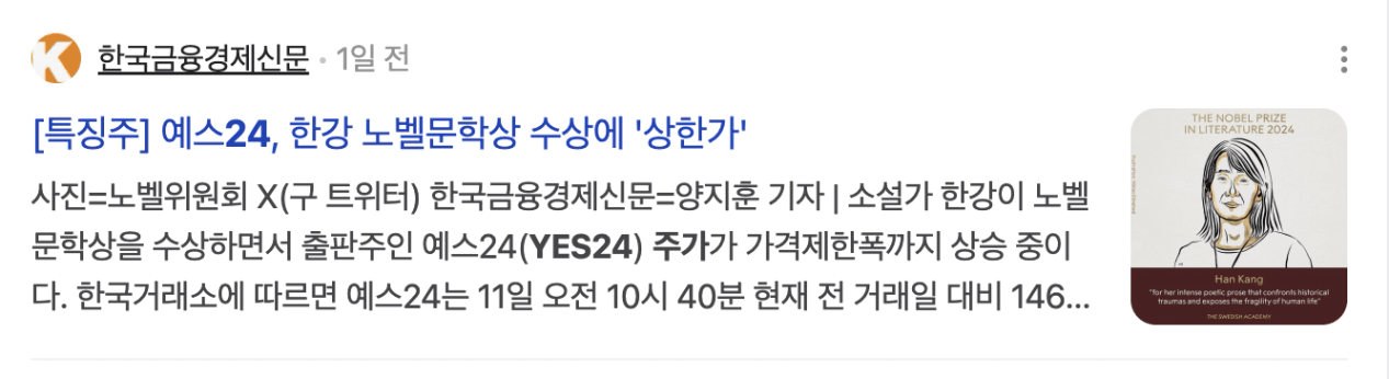 #노벨문학상 #노벨문학상 한강 #노벨문학상 수혜주 #노벨문학상 관련주 #예스24주가 #밀리의서재 주가 #예스24 노벨문학상 수혜 #노벨문학상 상금