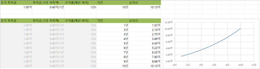 초기 투자금투자금 (1년 저축액)수익률[매년 복리]기간순자산