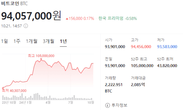 비트코인 가격이 9,400만원을 돌파했습니다.