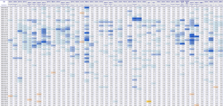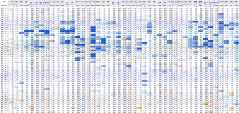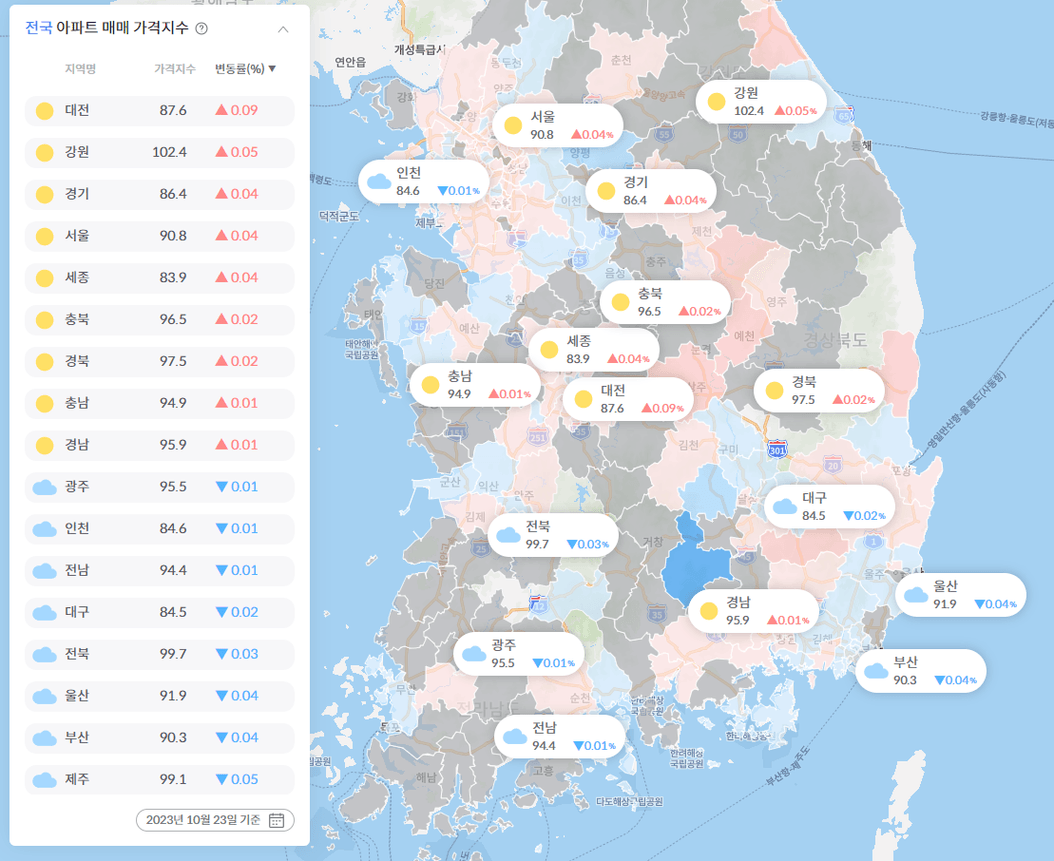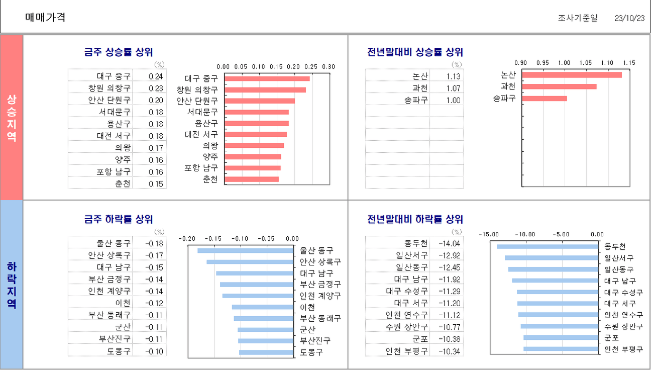 대전이 상승이고 나머지는 하락입니다