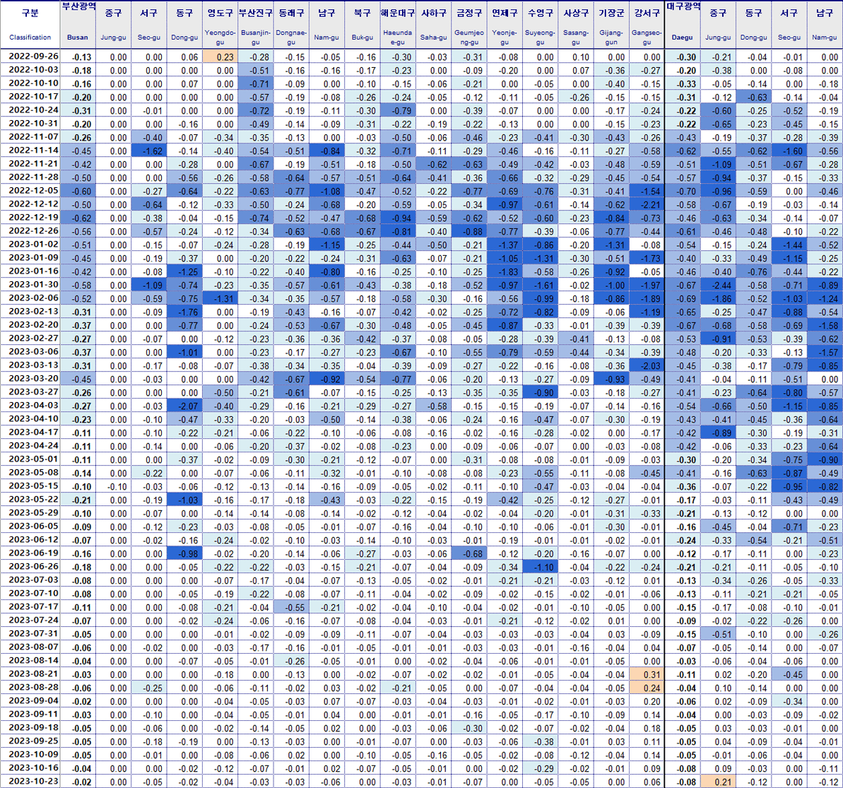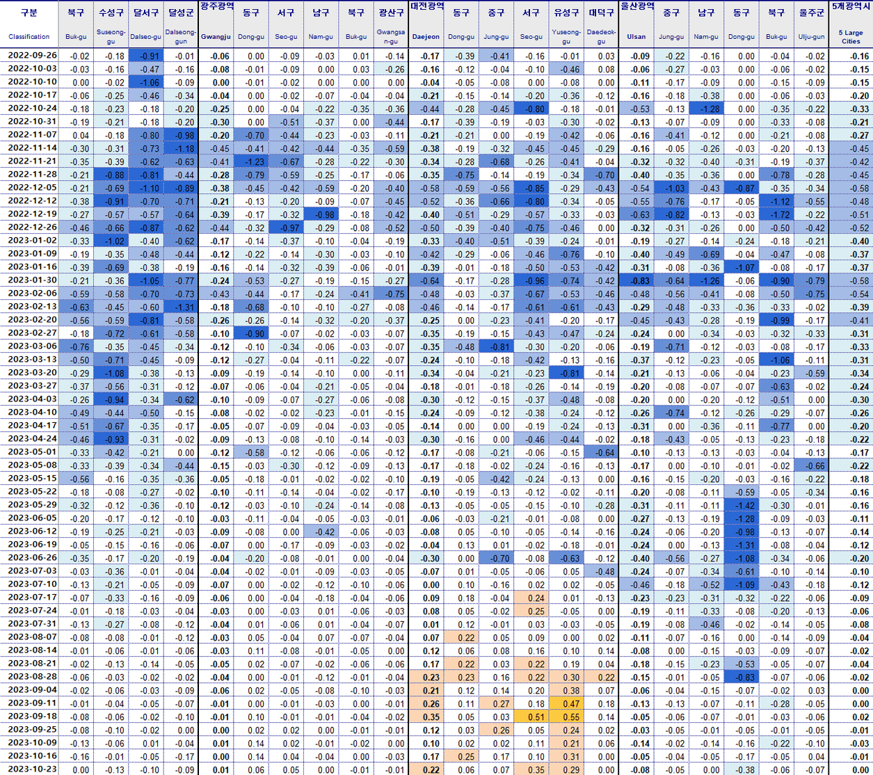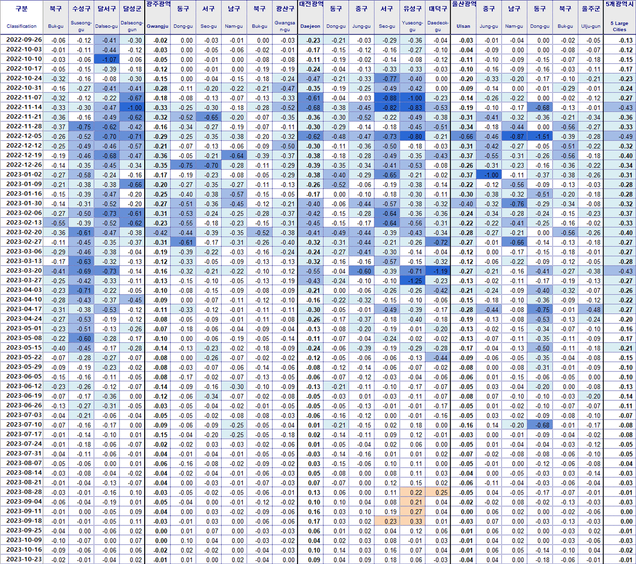 대구 수성구 -0.13% 동구 -0.12% 남구 -0.12% 달서구 -0.10% 달성군 -0.09%