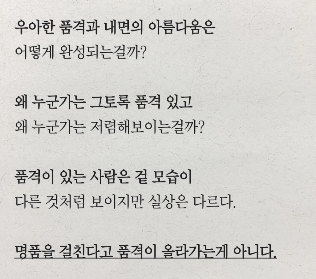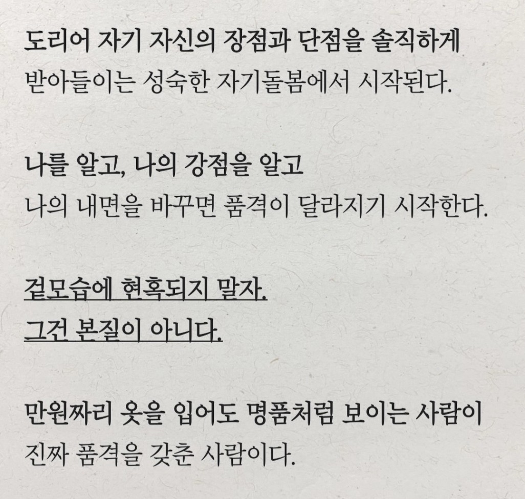 명품을 걸친다고 품격이 올라가는 게 아닌 것 처럼, 나의 강점을 알고 나의 내면을 바꾸는 것이 중요하다는 생각이 드네요