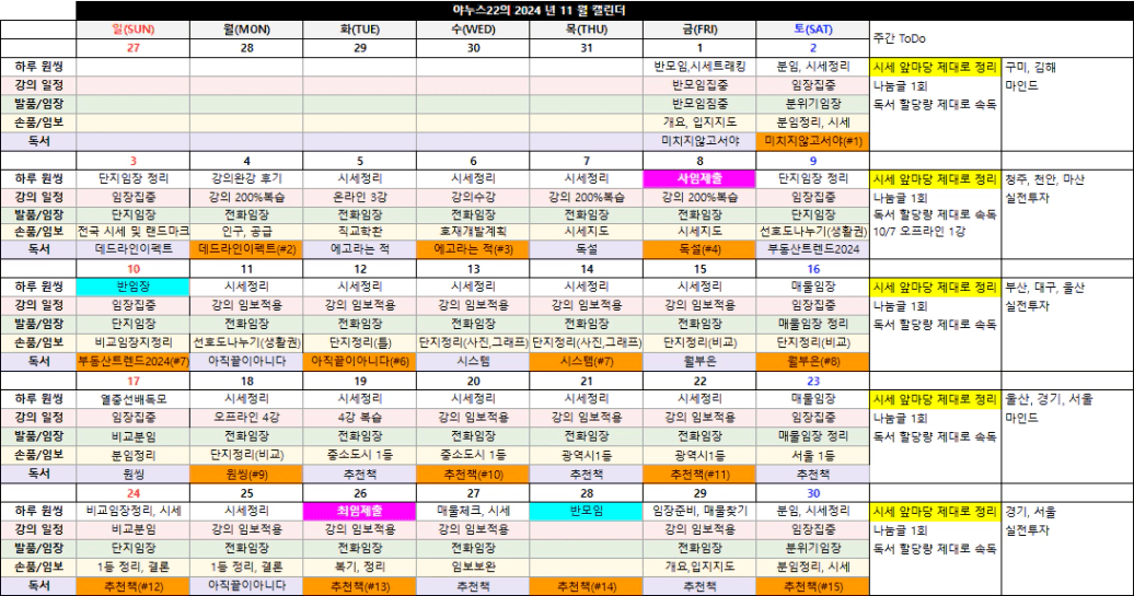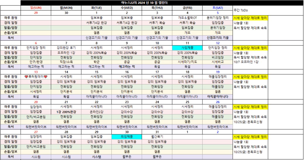 ✔️ 독서 15권 및 후기 15개 ✔️ 강의 완강 및 복습 200% ✔️ 임장 25회(연차 사용할 것) ✔️ 전임 50통 ✔️ 부동산 방문 25회 매물 100개 ✔️ 투자 앞마당 전수조사 ✔️ 1등 뽑고 매물코칭 받아 OK | ✔️매일 출근길 - 강의복습/유투브정리/기사정리 - 월부영상 나오는 날은 정리 ✔️칼럼 필사 매주 일일요일 저녁 ✔️나눔글 주 1회 ✔️매일 내가 한 거 복기 ✔️매물문의 월 1회! |