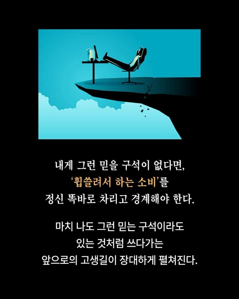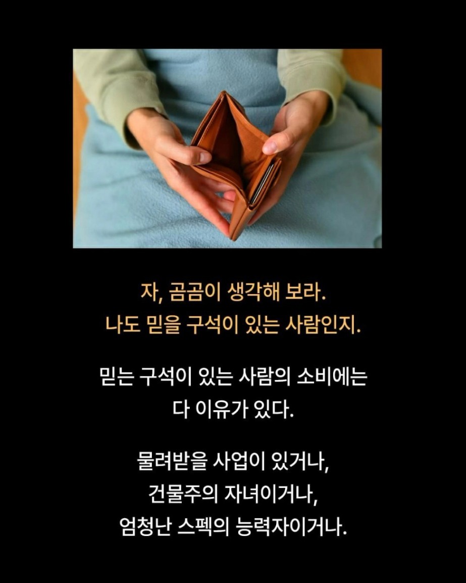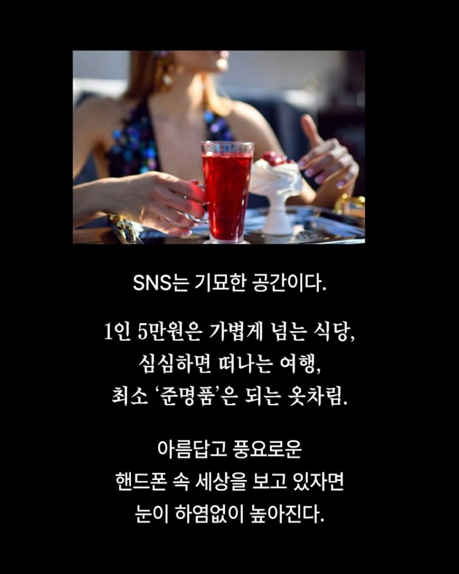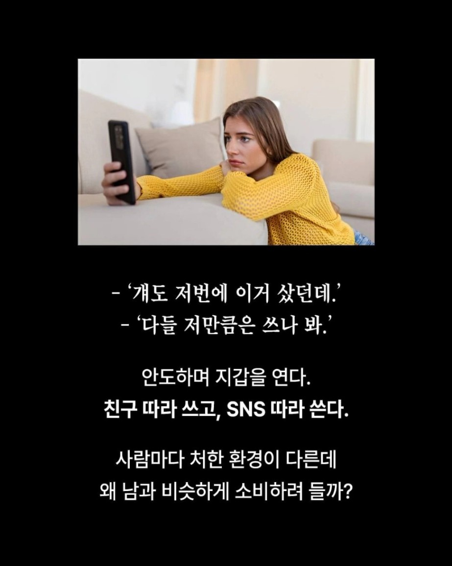 SNS라는 공간을 통해서 본인의 일상을 공유하는 건 좋지만 믿을 구석이 없음에도 남들 다하니까 똑같이 휩쓸려하는 소비를 경계해야 된다는 생각이 드네요