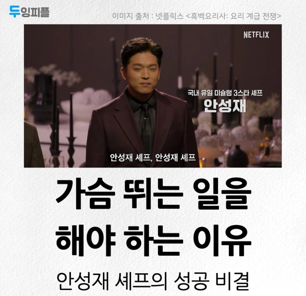 안성재 쉐프가 24살 비교적 늦은 나이에 시작해서 정상에 올라갈 수 있었던데는 가슴뛰는 일이라 생각하고