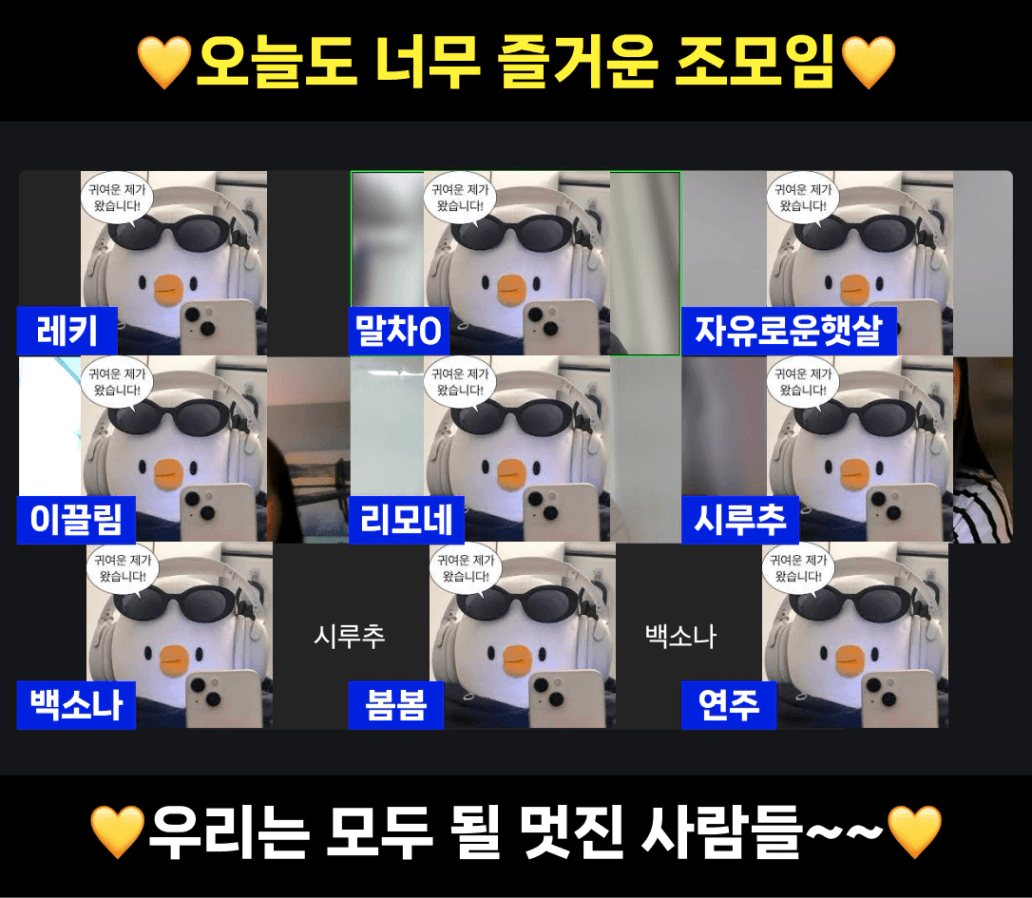 리모네님♡ 조모임 참석해주시고 또 많은 이야기들도 가득 꺼내주셔서 덕분에 조모임이 알찼던 것 같아요 >< 넘 감사드려요!!ㅎㅎㅎ 2주차도 화이팅해보아요!💖