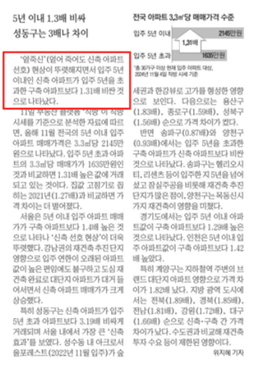 2. 얼죽신 아파트 이유 있었네 : 신축 / 구축 가격 더 벌어져