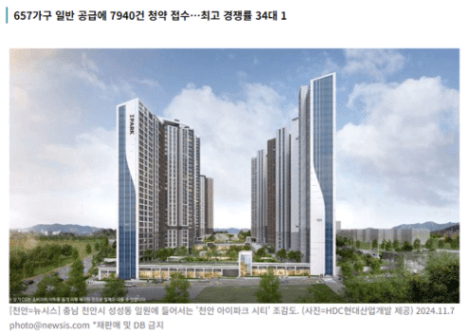 3. 천안아이파크시티 1순위 평균 12.1대 1 전 타입 마감