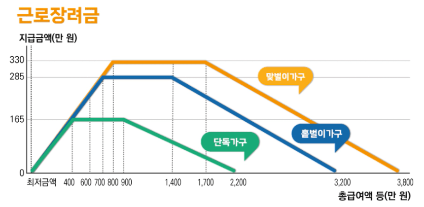 일을 하지만 소득이 적어 생활이 어려운 근로자, 종교인, 사업자 가구에 대해 가구 구성원과 총 급여액 등에 따라 산정된 근로장려금을 지급하면서 실질적 소득을 지원하는 ‘근로 연계형 소득 지원 제도’ 라고 볼 수 있습니다.