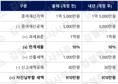 올해 증여한다면 현행 증여세율이 적용되어 증여세는 약 970만원 발생합니다. 만약 내년에 증여하면서 개정안에 따른 증여세율이 적용되더라도, 마찬가지로 약 970만원의 증여세가 발생할 것입니다.
