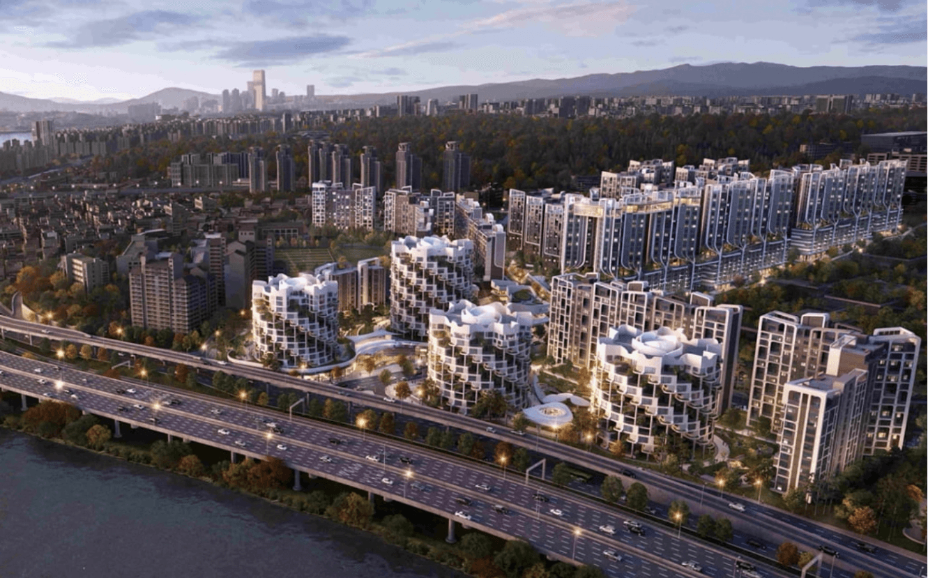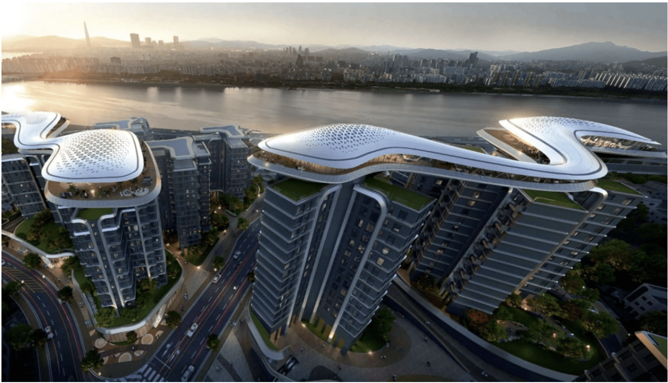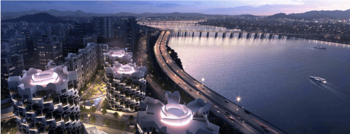 글로벌 설계사인 '유엔스튜디오'와 협업해 한강 변에 배치 된 4개의 동에 층별로 회전하는 듯한 나선형 구조의 디자인을 채택해 한강 조망권을 극대화 했습니다. 더불어 서울시청 앞에 있는 서울광장의 6배 규모인 1만 2000평 규모의 커뮤니티 시설도 설계에 담았다고 하니, 정말 엄청 나네요..!!